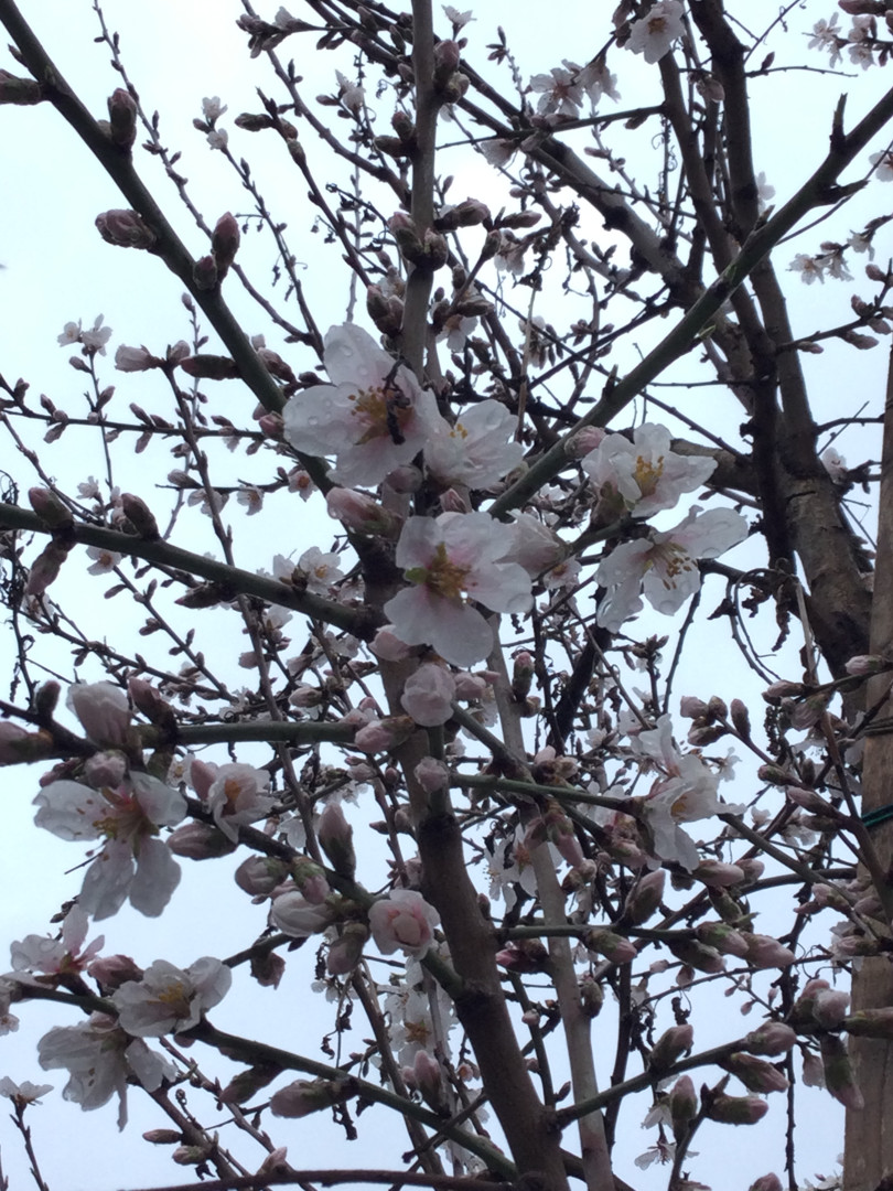 Február 16-án már csak két napot adtam a virágzásig, de aztán Zsuzsanna napja esővel és hűvös idővel jött, így egészen péntek, azaz február 23. reggelig egyetlen virág nem nyílt ki. Délután azonban már csak sorsolni lehetett volna, melyik virág volt idén az első. (Napra ezt a korai mandulavirágzási dátumot jegyezték fel 2016-ban egy Bakonyhoz közeli helyen is.)
